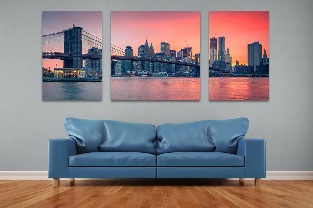 Jedną z ich propozycji są romantyczne obrazy, na których jest czarno-białe zdjęcie pary, szkic twarzy kobiety z użyciem kilku ciepłych kolorów lub grafika przedstawiająca serca. W przypadku ściany, która pomalowana jest szarą farbą, zdjęcie to wtopi się w tło, natomiast szkic i grafika, będą stanowiły wyraźny akcent kolorystyczny. Wnętrze, w którym ściany będą miały delikatną barwę, ożywi również obraz w formie tryptyku, który przedstawia Most Brooklyński o zachodzie słońca.