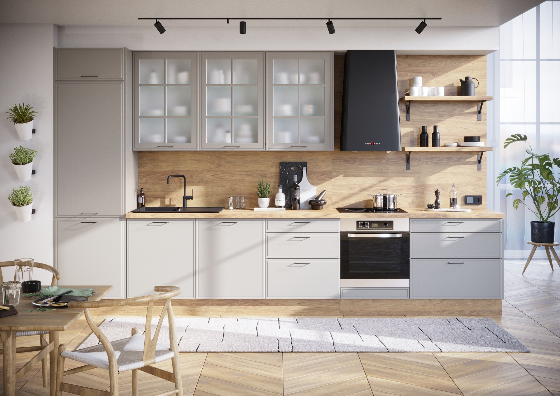 Nawet jeżeli szkło będzie przewodzić kuchennej aranżacji, z pewnością jej nie przytłoczy. To jego ogromna zaleta. Wzbogaca zabudowę meblową i zapewnia jej efekt stylistycznej świeżości, a jednocześnie nadaje lekkości i pozwala optycznie kształtować proporcje wnętrza. Fronty z przeszkleniami „odciążą” wizualnie nawet masywną bryłę mebli. Docenimy to szczególnie w przypadku systemów meblowych do wysokości sufitu.