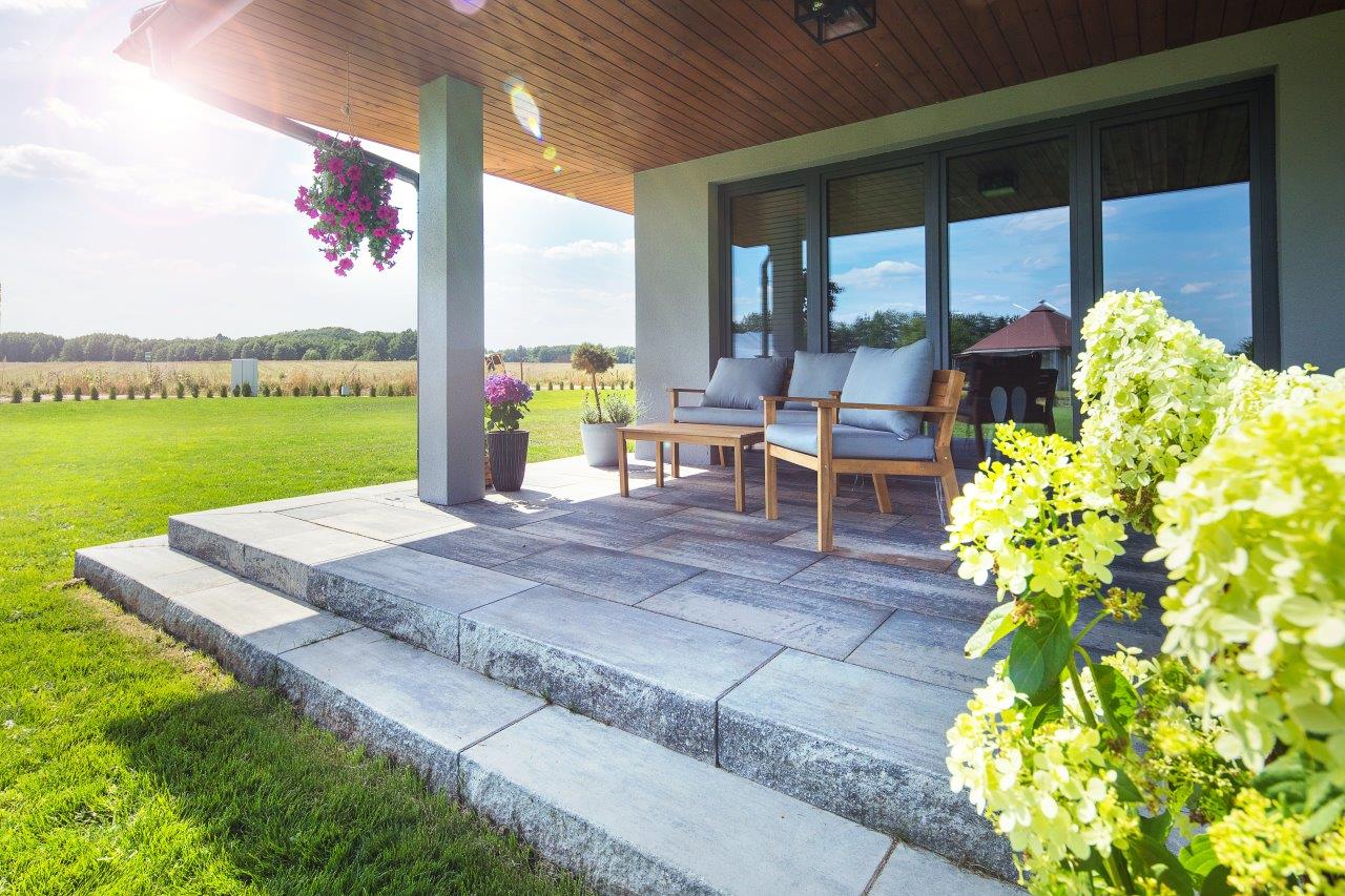 Niesztampowy design w połączeniu z szarością nie jest jedynym pomysłem na modny taras przy domu. Niezwykle popularne są również wielkie formaty, czyli płyty takie jak Polbruk Magna lub Lamell. Posiadają one geometryczny, prostokątny kształt oraz minimalistyczny charakter, który doskonale komponuje się z nowoczesnymi, a także bardziej klasycznymi aranżacjami. Magna to jedna z większych płyt betonowych dostępnych na rynku. Posiada wymiary: 100×75 cm i 50×75 cm. Wśród dostępnych kolorów znajduje się melanżowa szarość nerino. Alternatywą może być płyta Polbruk Lamell. Ma nieco mniejszy format: 60×40 cm i jest dostępna w gładkiej fakturze w dwóch odcieniach szarości – nerino i stalowym, natomiast w płukanej – w melanżowym kolorze ritmo_d. Porównując oba wielkoformatowe rozwiązania, należy zaznaczyć, że płyta Lamell, ze względu na grubość 4,5 cm, jest dedykowana nawierzchniom tarasowym, natomiast płyty Magna można zastosować również na podjazdach czy placach. Wynika to z dostępnych grubości 8 i 10 cm. Grubość 8 cm może być stosowana w ruchu samochodów do 3,5t; a 10 cm – w przypadku ruchu pojazdów powyżej 3,5t.
